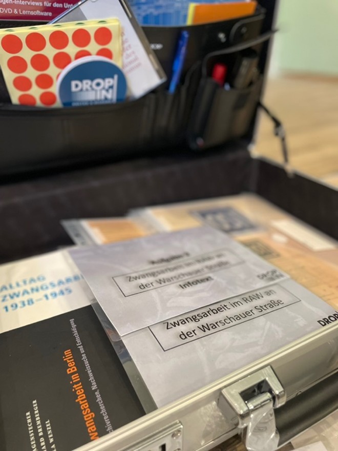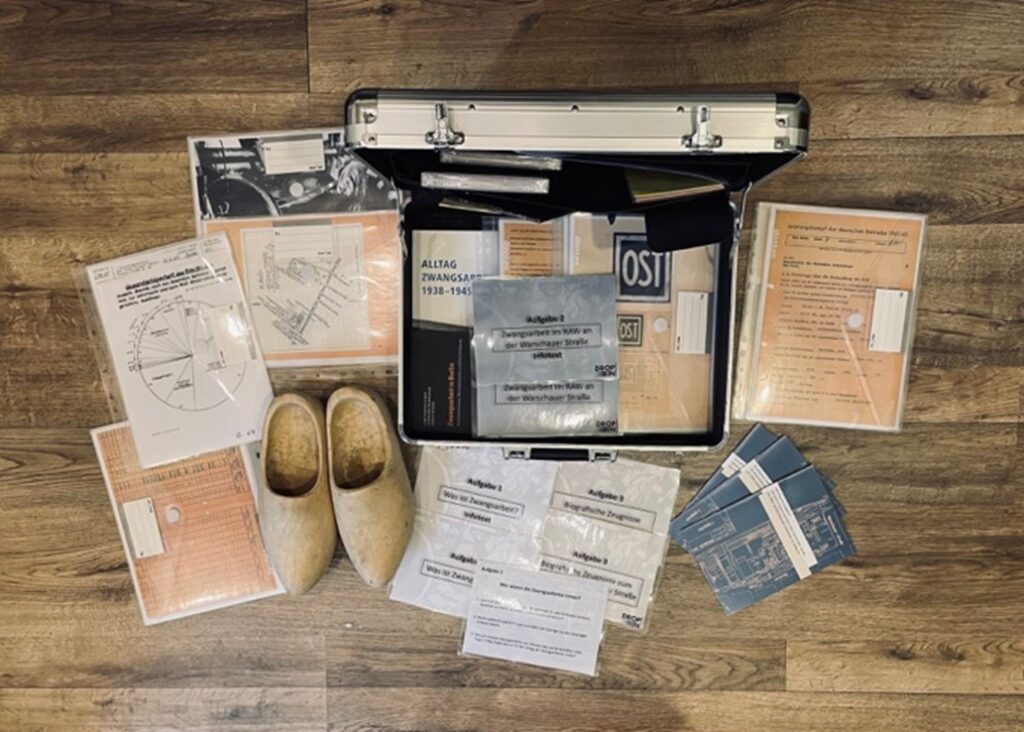 Im Projekt „Here’s to you…“ konzipierten wir pädagogische Materialien, die in einem Koffer versammelt und langfristig nutzbar gemacht wurden. Unser Methoden- und Materialkoffer eignet sich für zweistündige Workshops ab Klassenstufe 9, um das Thema NS-Zwangsarbeit niedrigschwellig zu erarbeiten. Neben einem allgemeinen Aktivierungs- und Erarbeitungsteil konzentrieren sich die Aufgaben, die einzeln oder in Gruppen erledigt werden, auf NS-Zwangsarbeit im RAW an der Warschauer Straße. Hierfür dienen die wenigen RAW-bezogenen biografischen Zeugnisse als zentrales Quellenmaterial, anhand dessen Alltag, Unterbringung, Ernährung, Arbeit, Selbstbehauptung, Entschädigung und Erinnerung erarbeitet werden können. Die biografischen Quellen werden flankiert von Auszügen aus zeitgenössischen Dokumenten wie einer Sparkarte zur Illustrierung des perfiden Systems des sogenannten „Ostarbeitersparens“, Abbildungen der stigmatisierenden Aufnäher „P“ (Polen) und „OST“ (Ostarbeiter), Fotografien (insbesondere das Propagandafoto eines Ostarbeiters in einer der RAW-Werkhallen), der Zeichnung des täglichen Arbeitsweges vom Zwangsarbeiterlager Wuhlheide zum RAW an der Warschauer Straße, einem Geländeplan sowie Bekanntmachungen und Verhaltensvorschriften der Werksleitung. Zudem findet sich im Material- und Methodenkoffer zur Anschauung ein altes Paar Holzschuhe in der Art, wie sie die Zwangsarbeiter:innen tragen mussten.